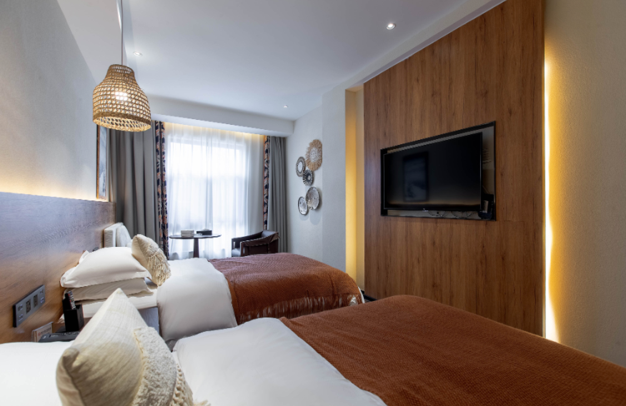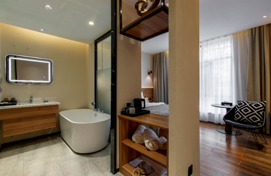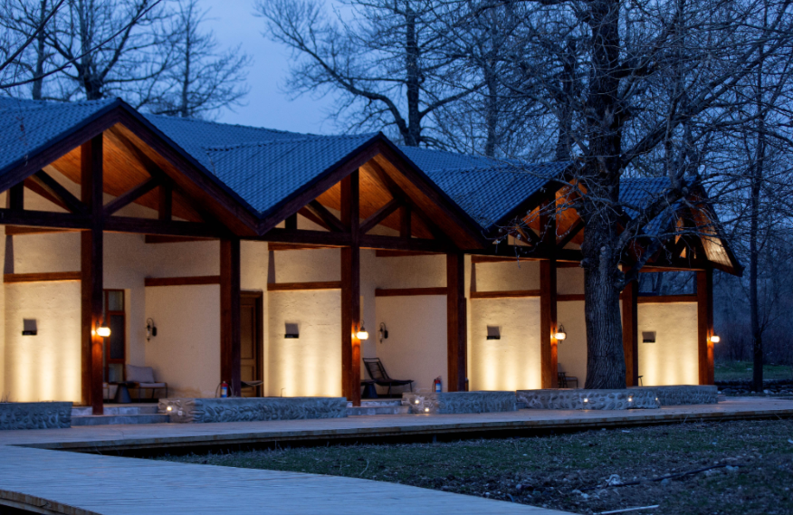 占地面積80畝,坐落于森林里,采用木屋、石頭、玻璃等主材建造,立志打造“在自然里長出的建筑”,室內室外一步一景。 酒店一期客房數(shù)量55間,其中普通標準間32間,大床房10間,家庭房2間,庭院房11間,餐廳面積300㎡,客房具有面積大,空間視野好的特點,按照準五星級生態(tài)園林酒店的標準配備高檔、精致家具及潔具,裝飾裝潢強調統(tǒng)一中顯個性,力求舒適、溫馨、實用。