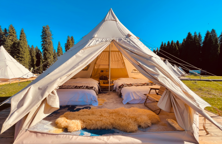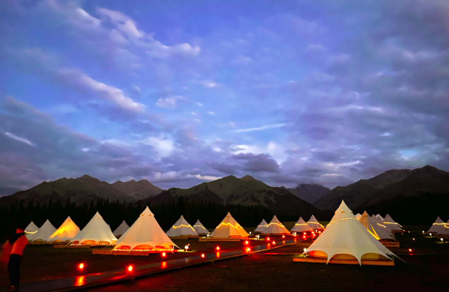 1、營地坐落于海拔 1500 米的云上草原,視野開闊,營地帳篷區(qū)采用露營帳篷天花板,北歐頂級(jí)戶外品牌“Tentipi” 及丹麥戶外品牌“Nordisk”,顏值高,空間大又穩(wěn)定抗風(fēng),夜晚睡在山間也無懼風(fēng)雨,每間房配備品牌洗護(hù)、保溫暖爐、沙發(fā)等,在“天然氧吧”酣然入眠。再迎著喀班巴依峰日出醒來。
